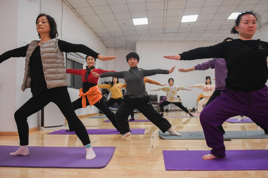2023年12月28日,在武汉市洪山区华侨城社区活动室,学员在上瑜伽课。