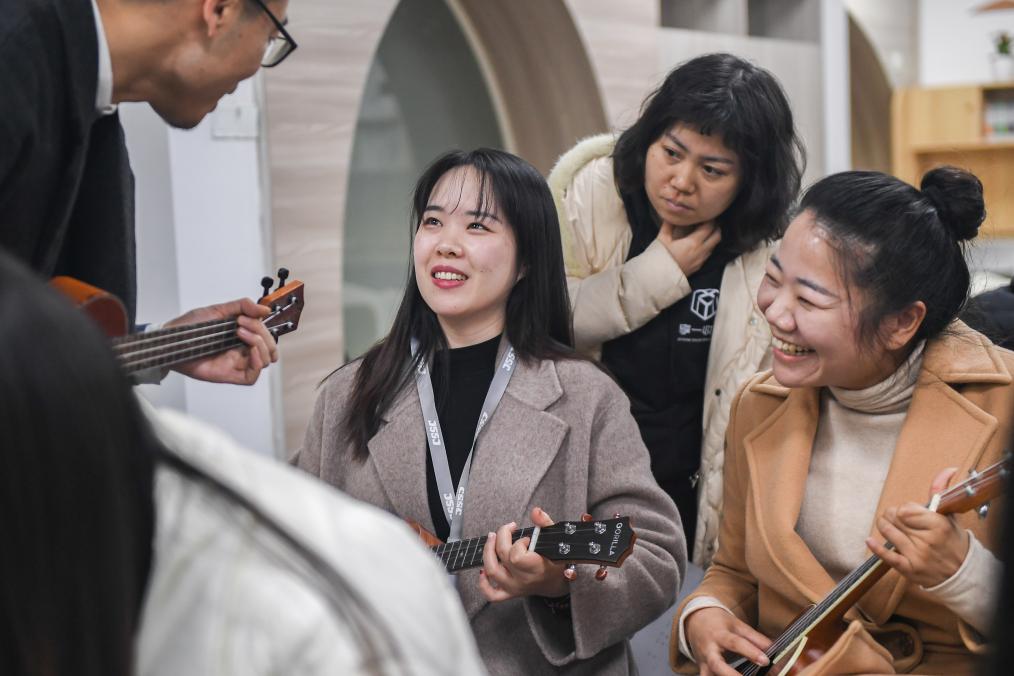 晚上七点,武汉市汉阳区梅林都汇社区二楼的共享自习室内,灯火通明的教室里,青年人们围坐在一起,几乎人手一把尤克里里,手指拨弦声此起彼伏,不时还传来轻快的笑声。