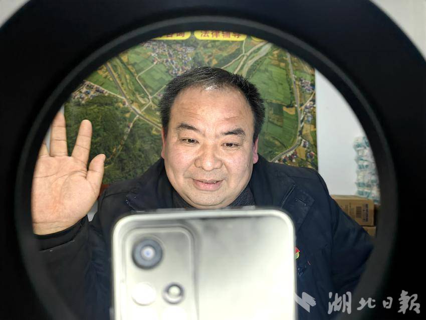 1月17日晚7点半,忙完一天的工作,雷国峰开启了网络直播。一面简单的背景墙、一台支架、一部手机……这个简易的直播间就搭建在村委会办公室。