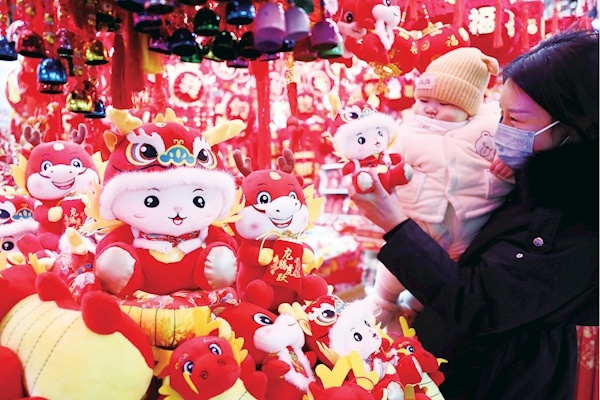 1月23日,在鄂西北小商品批发市场内,不少融合了“龙”元素的商品吸引顾客驻足选购。春节临近,年货市场中各具特色的龙年主题春联、呆萌的龙布偶等深受消费者喜爱。市民在年货挑选中感受着渐浓的年味儿,同时也体验着传统文化的独特魅力,红火的“生肖经济”激活了新年消费市场。记者全正摄