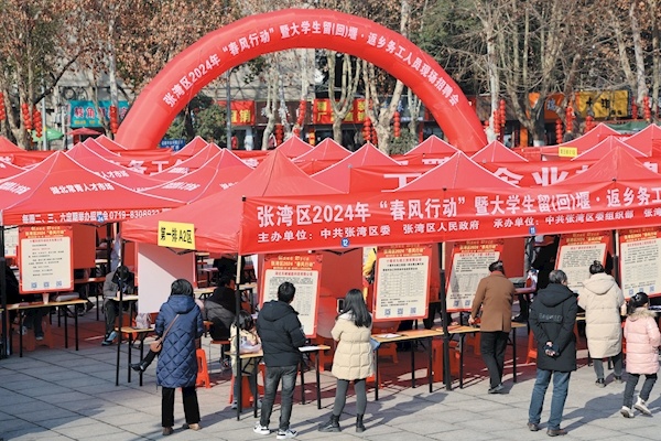 1月27日上午,张湾区2024年“春风行动”暨大学生留(回)堰返乡务工人员现场招聘会在青年广场举行,300家企业及事业单位参会,提供汽车制造、外贸、电子商务、商贸物流等岗位5000余个。据统计,当日招聘会现场求职人数达4000余人,达成就业意向600多人。春节前后,该区将开展2024年“春风行动”系列招聘服务活动,拟推出30余场线上线下招聘会,全力稳就业、保用工、促发展。记者全正特约记者许荣旗通讯员李青丽摄