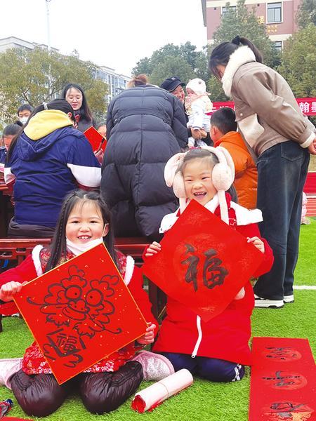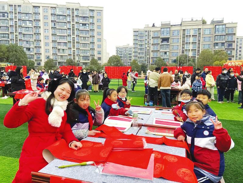 当日上午,在白云湖小学操场上,学生们以小组为单位,在教师的精心准备和指导下,饱蘸香墨,行云流水,将一份份美好祝福挥洒在红纸上,把一句句祝福祈愿融入字里行间,现场一派热火朝天的景象。
