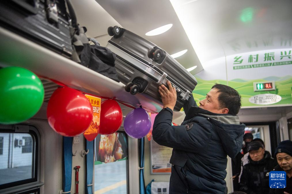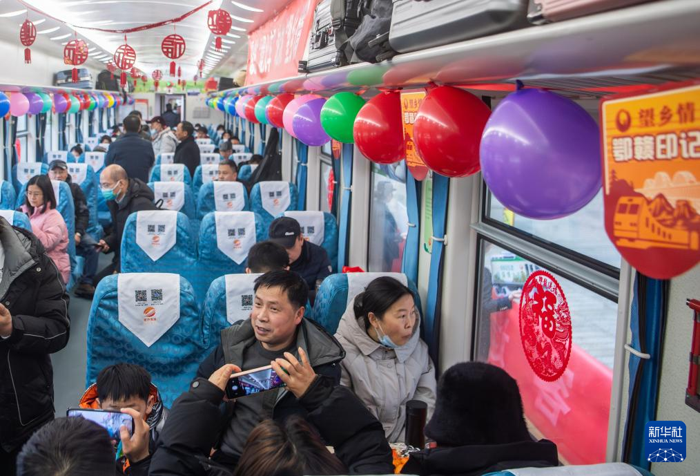 临近春节,旅客们乘坐这列公益“慢火车”踏上归家之旅。铁路工作人员用彩带、气球、窗花等装饰车厢,公益“慢火车”上洋溢着浓浓的年味儿。
