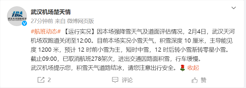因本场强降雪天气及道面评估情况,2月4日,武汉天河机场双跑道关闭至12:00。目前本场实况小雪天气,积雪深度10厘米,主导能见度1200米,预计12时前小雪为主,短时中雪,12时后转小雪渐转零星小雪。截止09:00,已取消航班278架次,进出交通因路面积雪,行车缓慢。具体航班延误信息,请咨询相关航空公司。(国际航空公司:95583:东方航空95530南方航空:95539海南航空:95339厦门航空:95557四川航空:95378深圳航空:95361山东航空:95369春秋航空:95524)