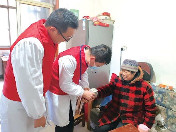 春节前夕,市中医医院“常青藤”服务队志愿者走进龚家湾社区,上门为社区老人送医送药,开展冬季慢性病防治健康科普,让老人们了解高血压、糖尿病等症状,引导他们通过饮食、运动、情志调理等健康生活行为方式,预防和控制慢性病的发生。图为志愿者们上门为老人服务。图/通讯员 刘勤