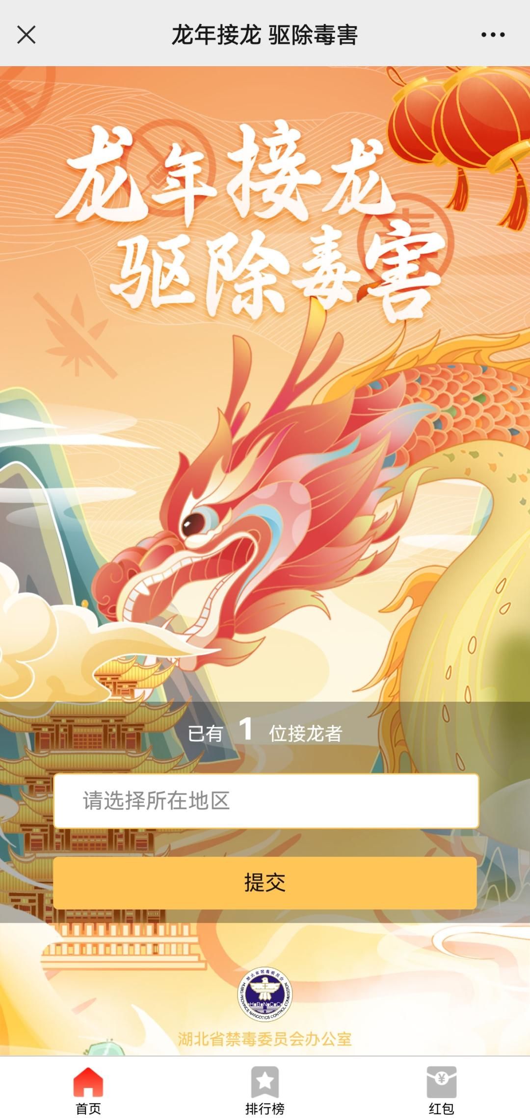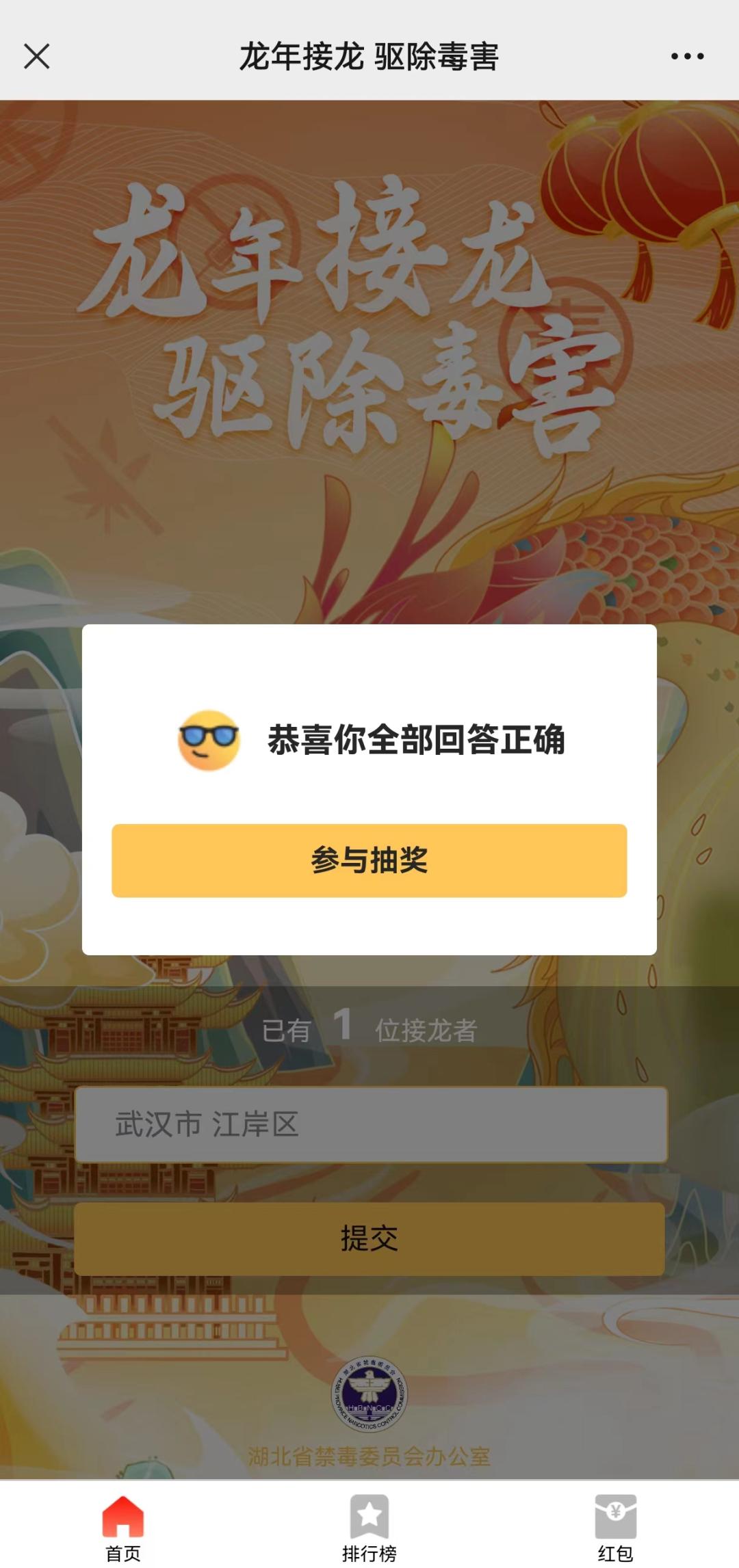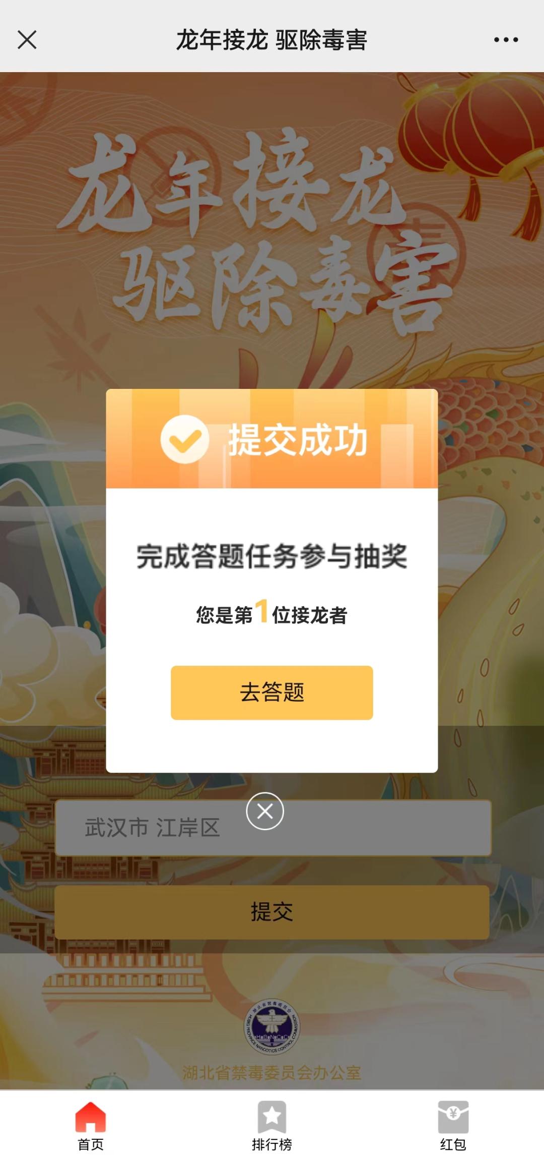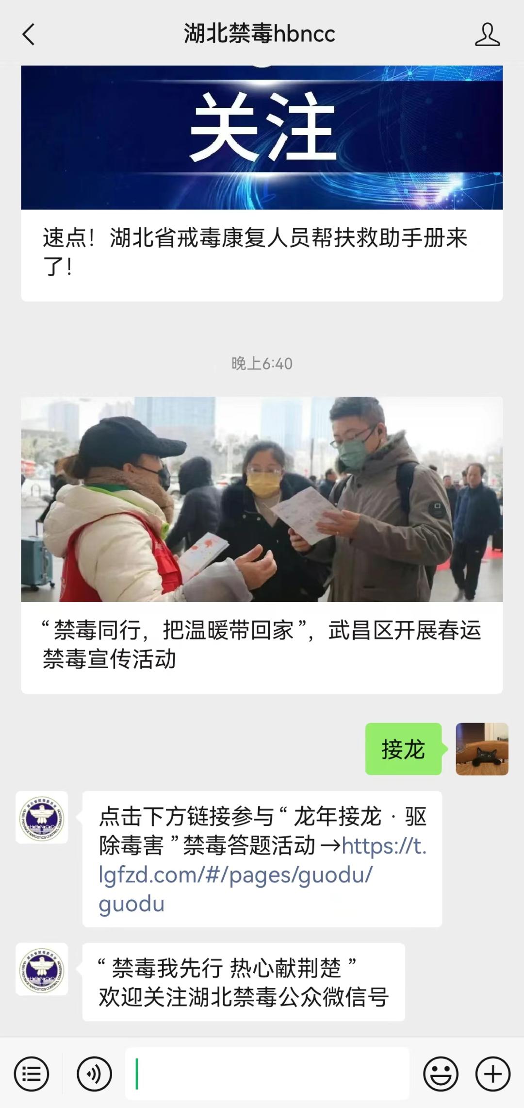 ●在湖北禁毒微信首页点击“发消息”后输入“接龙”,或点击下方“禁毒参与”—“龙年接龙”获取活动入口;