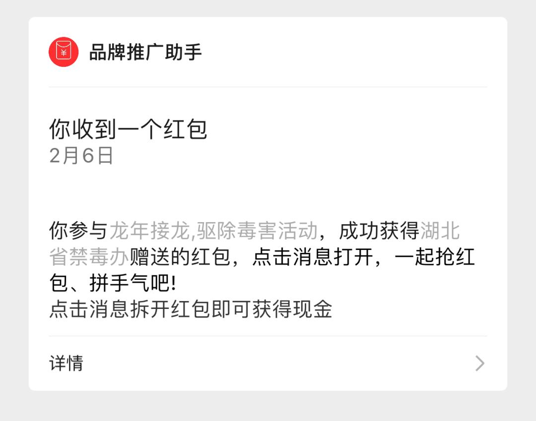 ●中奖后,将会收到由微信【服务通知】发来的名为“你收到一个红包”的推送消息,点击消息拆开红包即可获得现金。