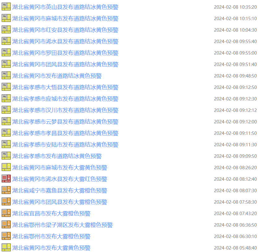 湖北部分地区发布大雾橙色预警及道路结冰黄色预警
