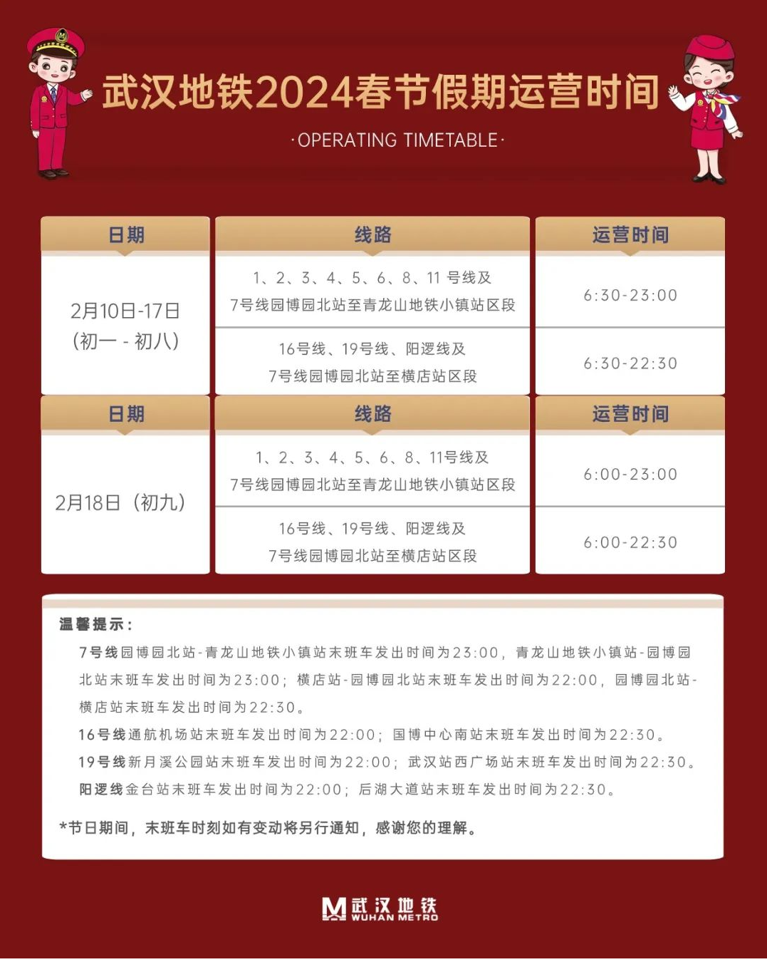 2024年2月18日(初九),轨道交通1、2、3、4、5、6、8、11号线及7号线园博园北站至青龙山地铁小镇站区段运营时间为6:00至23:00;轨道交通16号线、19号线、阳逻线及7号线园博园北站至横店站区段运营时间为6:00至22:30。