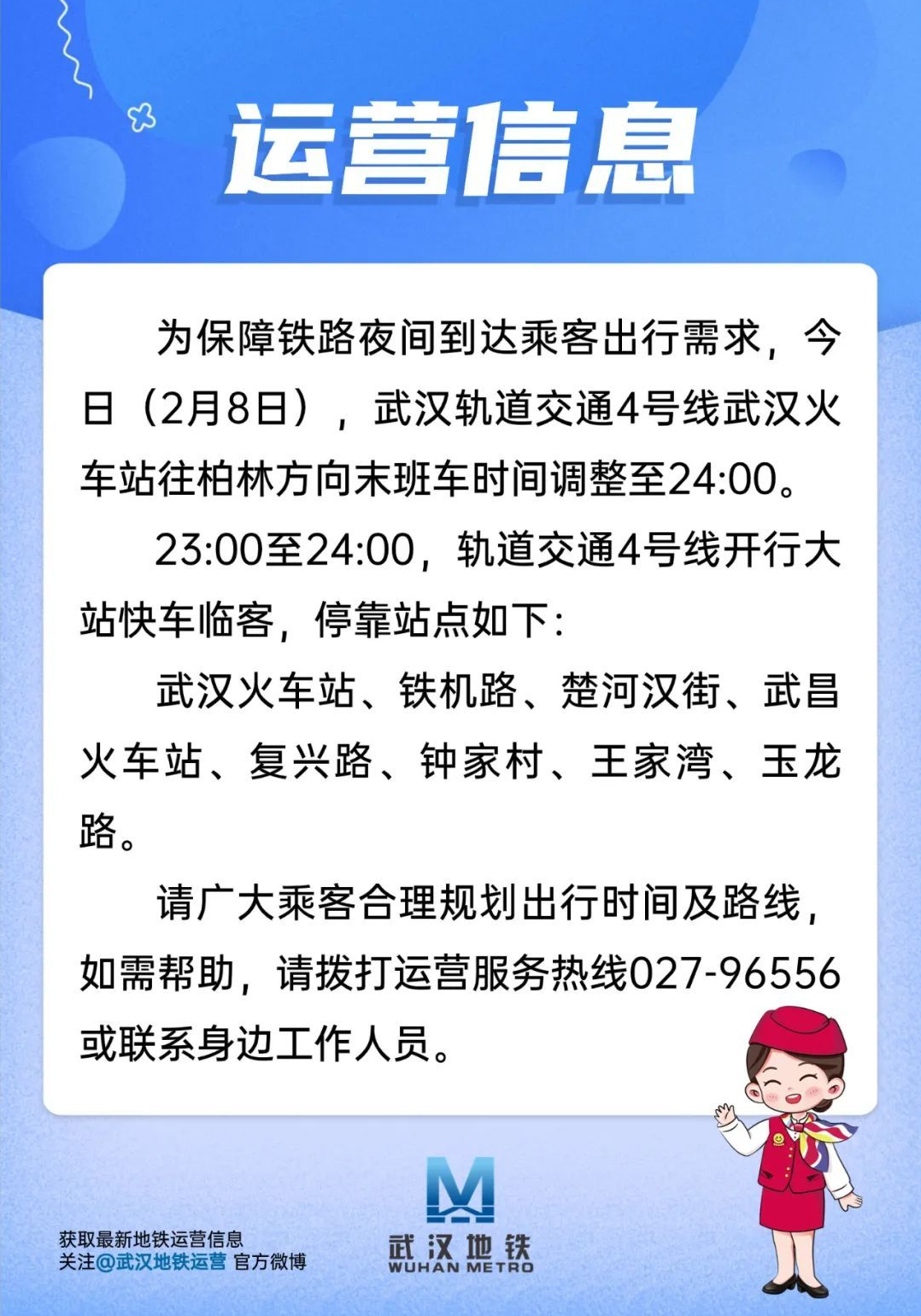 2月8日,武汉轨道交通4号线武汉火车站往柏林方向末班车时间调整至24:00。23:00至24:00,轨道交通4号线开行大站快车临客,停靠站点为:武汉火车站、铁机路、楚河汉街、武昌火车站、复兴路、钟家村、王家湾、玉龙路。