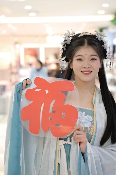 穿汉服的少女手拿福字喜迎新年。记者全正摄