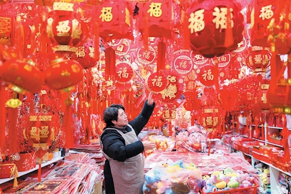 在十堰城区鄂西北小商品批发市场,大红灯笼高高挂起,灯笼、春联、福字等节庆用品热销。记者全正摄