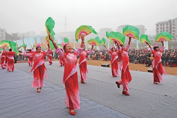 竹山县体育广场,来自城关镇9个社区的群众文艺队表演精彩的文艺节目。通讯员邵义龙摄