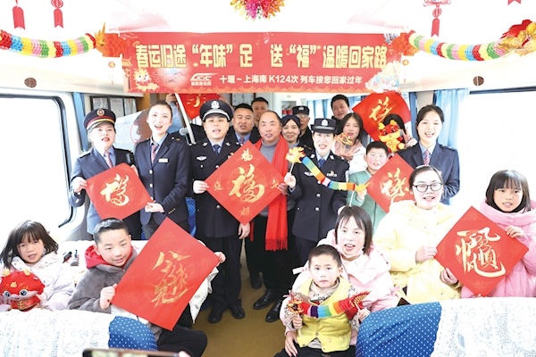 “我是上海人,来十堰工作已经快40年了。好几年没回老家过年了,今天带着家人们一起回宝山和亲人们团聚。一进十堰火车站,看到车站、列车上满是年画、窗花、灯笼、福字,感觉年马上就要到了,特别有过年的气氛。”旅客任先生踏上十堰—上海南的 K124次列车时感慨地说。