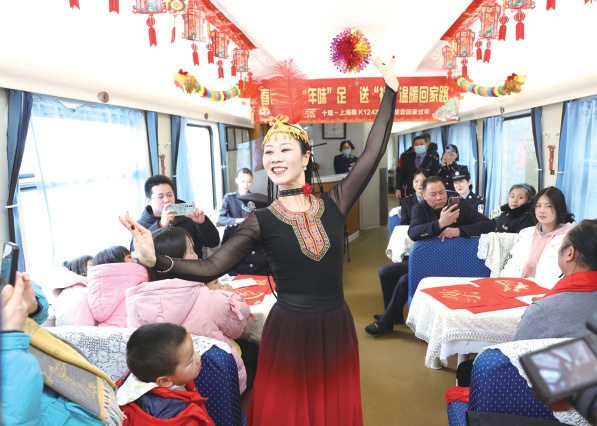 昨日,中国铁路武汉局集团有限公司襄阳客运段、十堰车务段、襄阳铁路公安处共同邀请书画家张斌、全华,以及铁路文艺者们一行,踏上了由十堰站始发至上海南站的 K124次列车,在列车上举办了一场充满浓郁湖北民族特色的迎新春联欢活动,让回上海过年的老一代三线建设者们体验到列车上别样的年味。