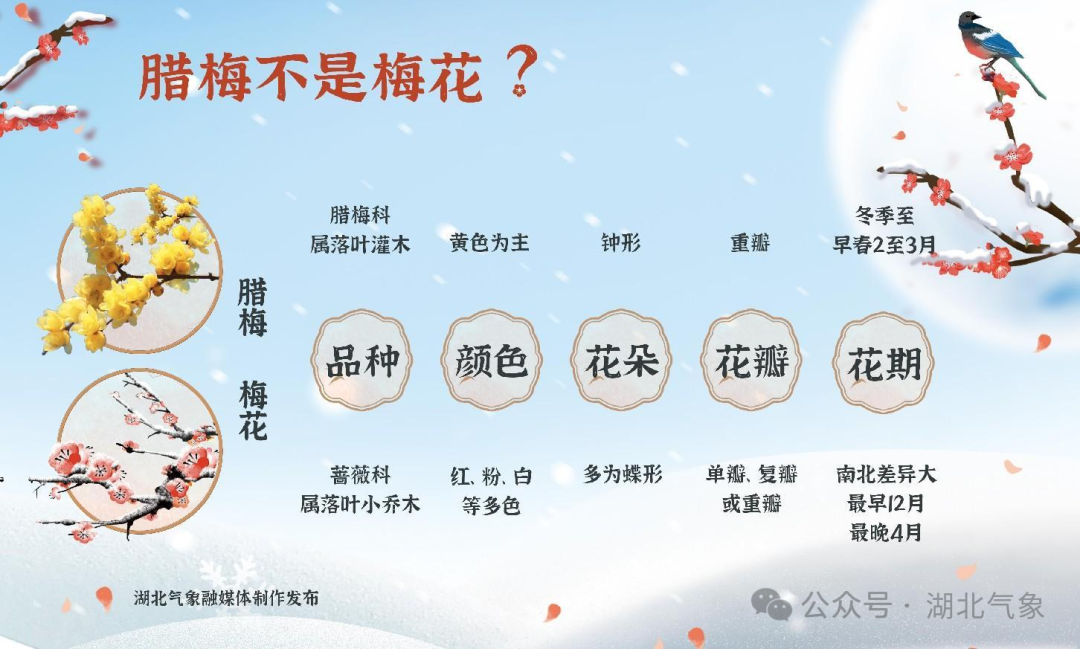 梅花与松、竹并称为“岁寒三友”,属于耐寒花卉,影响梅花开花时间的因素主要是积温,开花前10天或15天的气温最为重要。研究表明,日平均气温5℃以上,积温达到160℃左右,梅花就能开花。作为武汉市市花的梅花在江城种植较为广泛,许多公园都可观赏。