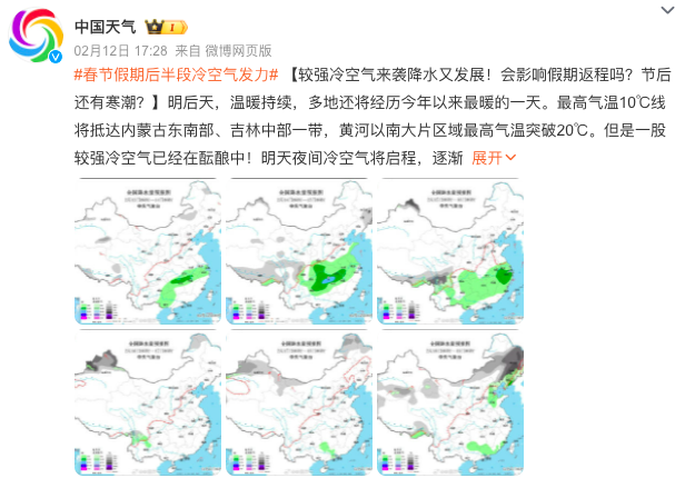 据中国天气网报道,今明两天,温暖持续,多地还将经历今年以来最暖的一天。但是一股较强冷空气已经在酝酿中!今晚(2月13日)夜间冷空气将启程,逐渐给大部地区带来降温。