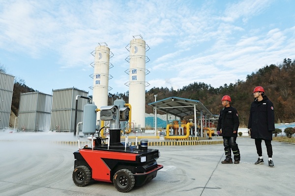 ▶2月16日,在十堰中燃 LNG储备调峰站,工作人员与机器人协同配合进行巡视。