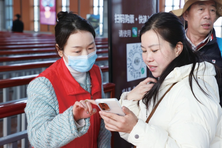 2月16日,武当山景区志愿者帮助游客网上购票。
