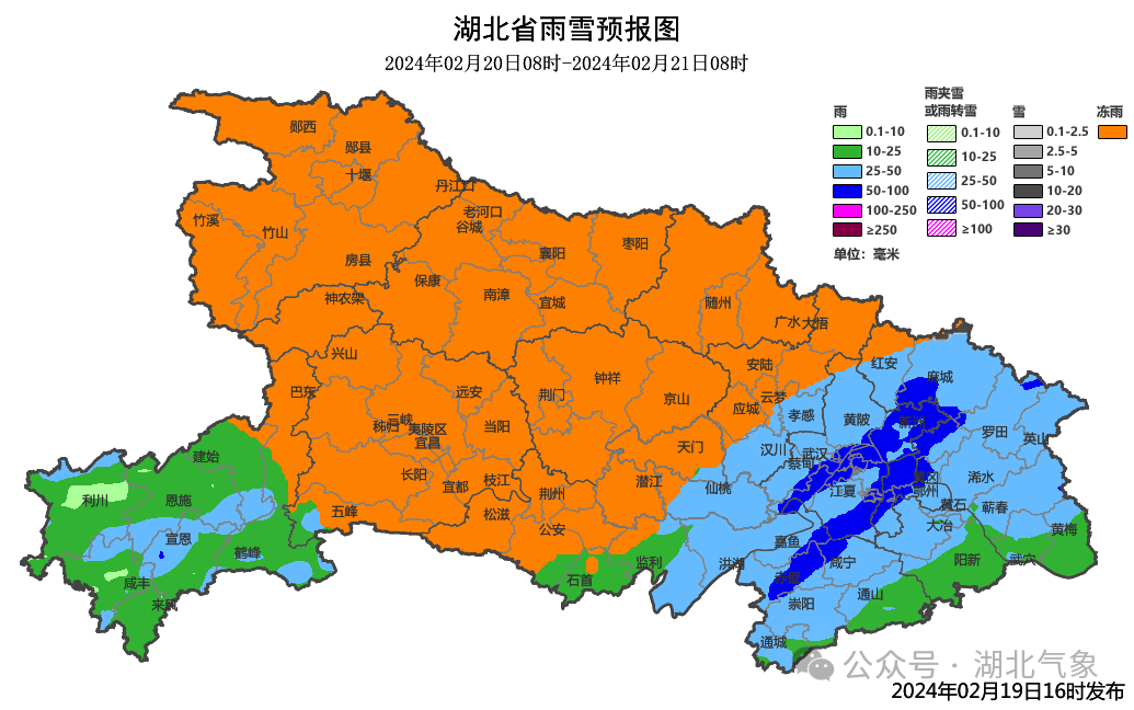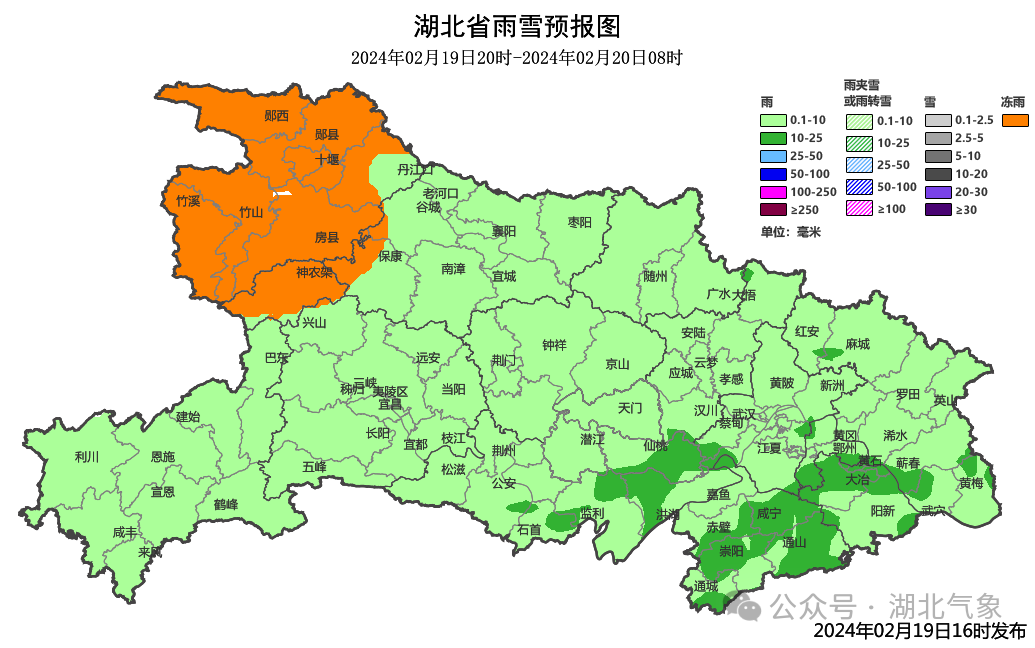 (2月20日08时-21日08时)鄂西北北部冻雨转中到大雪,局部暴雪;鄂西北南部、鄂西南北部、江汉平原、鄂东北西部中雨转冻雨或冰粒;其他地区阴天有中到大雨,局部暴雨并伴有短时强降水、雷暴大风、冰雹等强对流天气。最高气温北部2~6℃、南部7~10℃,最低气温北部-4~0℃、南部1~5℃。偏北风4到6级、阵风7到10级。