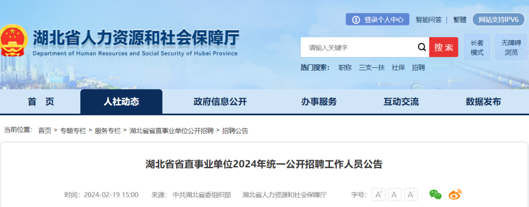本次公开招聘考试的注册、报名、查询、缴费、打印准考证、笔试成绩发布等,通过湖北省人事考试网(https://rst.hubei.gov.cn/hbrsksw/)进行。