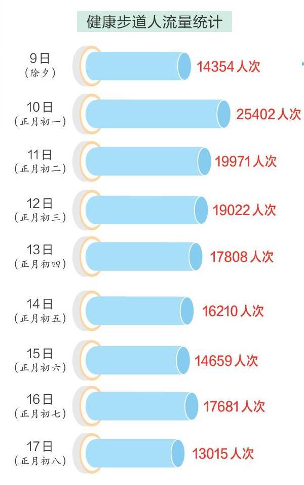 今年春节天气适宜,健康步道上游人如织,成为市民在城区游玩的首选之地。数据统计,从大年三十到正月初八9天时间里,健康步道共接待游客近16万人次,平均日进入人数近1.8万人次。图/记者刘成臣