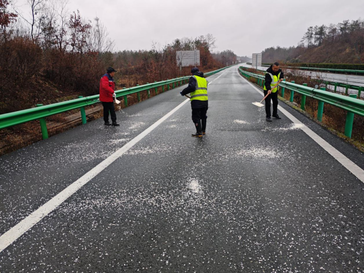 精准撒布融雪剂。十堰、宜昌等冻雨天气片区凌晨起共撒布融雪剂7吨,有效防止道路结冰。全域服务区及时铺设防滑垫、草垫等,全力保证司乘安全通行。