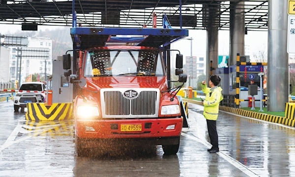 2月20日上午,在湖北交投襄阳运营公司六里坪收费站出入口,市公安局高警支队民警提醒驾驶员注意行车安全。据悉,为应对此轮雨雪天气,我市公安部门联合路政、交投等单位储备融雪剂1210吨,撒布机、除雪车等大型设备117台,组建抢险救援队伍19支188人,全力以赴保安全、保畅通。记者 刘旻 摄