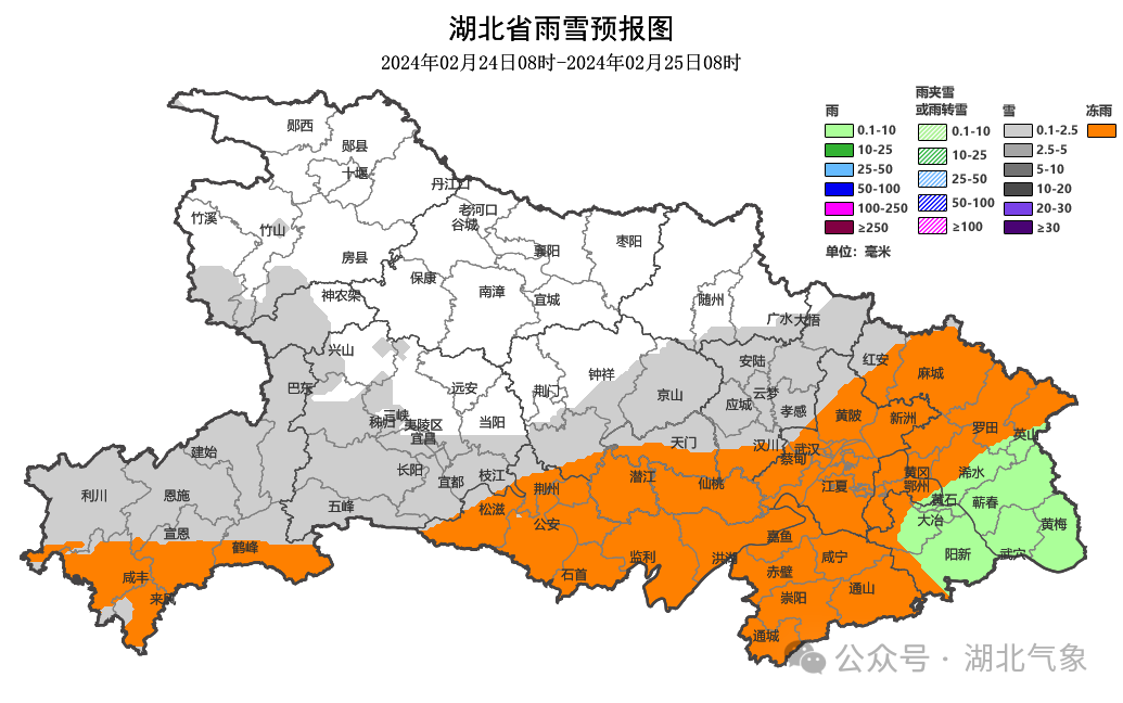 2月24日08时-25日08时,十堰、襄阳、随州、宜昌北部、荆门北部阴天;神农架、恩施北部、宜昌南部、荆门南部、孝感有小到中雪;恩施南部、荆州、天门、潜江、仙桃、武汉、鄂州、黄冈北部、咸宁有冻雨或冰粒;黄冈南部、黄石有小雨。最高气温大部地区0~3℃,最低气温大部地区-2~1℃。偏北风2到3级。