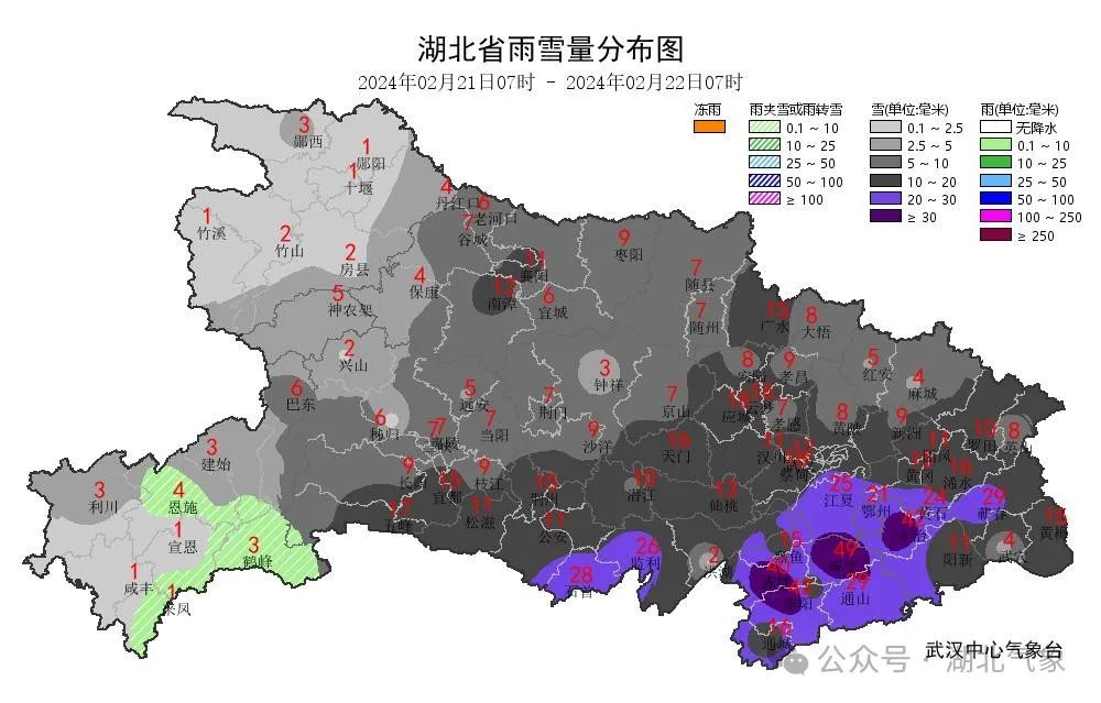 昨日(21日)07时至今日07时,我省除十堰和恩施以外,大部地区出现大到暴雪、冰粒或冻雨。截至今日05时,全省绝大部分市县均出现1~9厘米积雪,襄阳城区、南漳、 咸宁城区积雪深度达到9厘米。