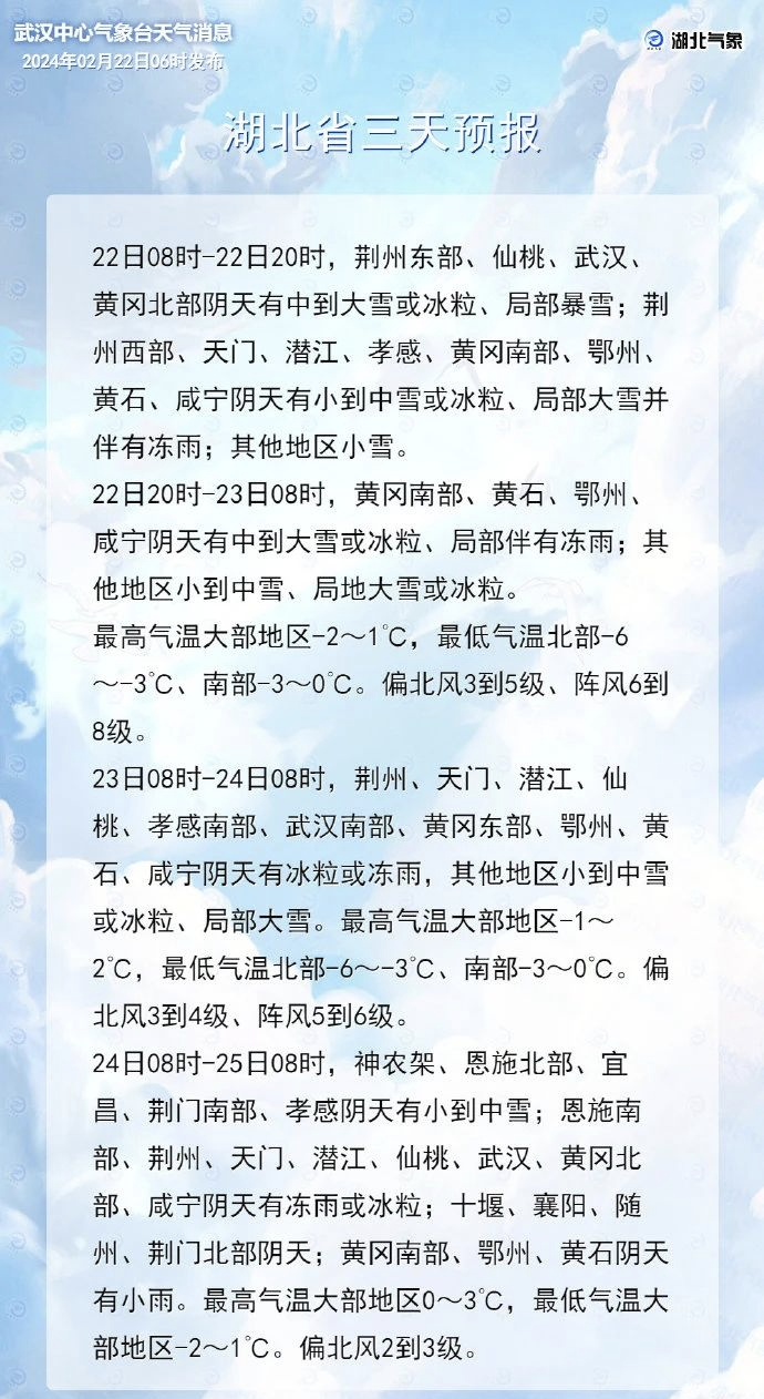 湖北省气象局官网2月22日上午发布最新天气预报,预计2月22日至25日,湖北低温雨雪冰冻天气持续。今天(2月22日),中东部仍有较明显降雪,尤其是江汉平原东部到鄂东北一带有中到大雪或冰粒、局部暴雪;其它地区也有小到中雪或冰粒、冻雨。最高气温大部地区-2~1℃;最低气温北部-6~-3℃、南部-3~0℃,山区-10℃左右。