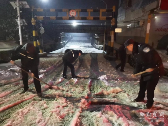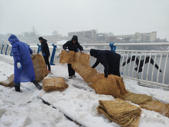 2月22日上午,在东洲桥路段扫雪现场,赤壁市建工集团工作人员正顶风冒雪手持铁锹、雪铲等清扫工具,铲除桥梁上的积雪,铺设草毯防滑。