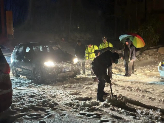 赤壁市公安局民警立即冒雪进行救助,最大限度为受困受阻车辆司乘人员提供帮助。同时对路面进行紧急清理,消除安全隐患,现场疏导车流,确保尽快恢复正常通行。