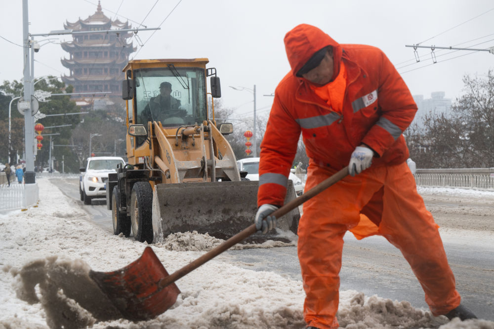 22日中午,长江南岸蛇山之巅,黄鹤楼上白雪皑皑。不远处的武汉长江大桥上,环卫工人紧张忙碌,扫雪车来回穿行,被铲开的雪渣飞向路肩,柏油马路逐渐露出本来颜色。