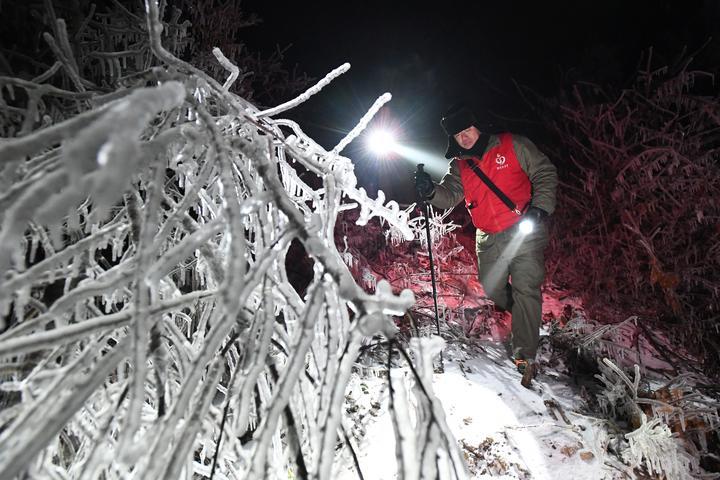 2月21日夜间,在武汉市最北端的清凉寨,黑暗不时被强光手电的光束划破。敲掉铁塔上的冰层,腰间系挂好安全绳,3名国网武汉供电公司的工作人员开始艰难地向上攀爬。