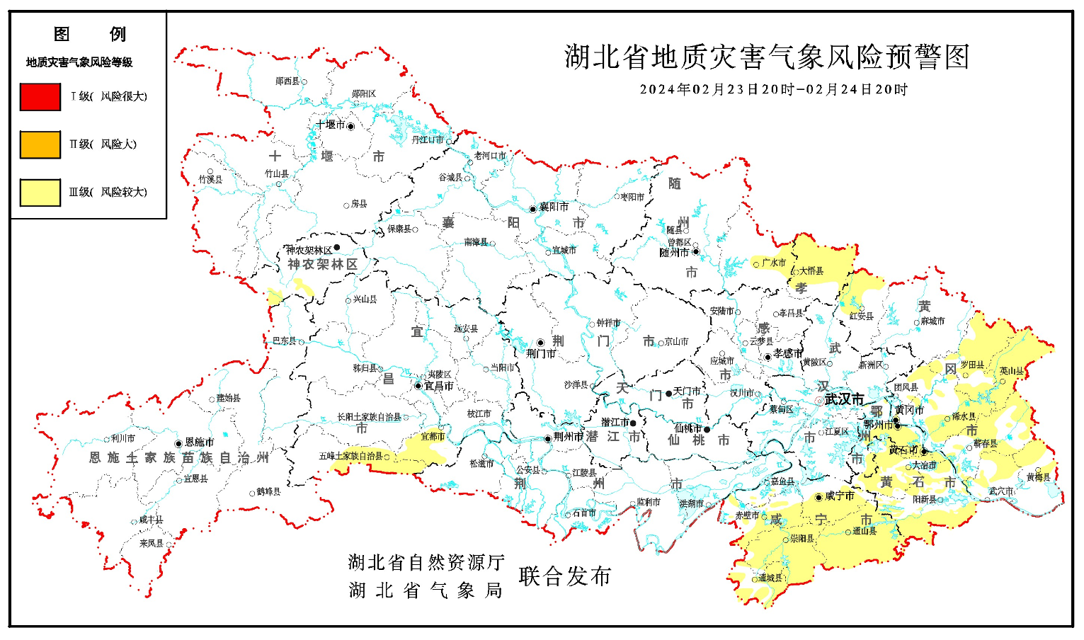 2024年2月23日20时—2月24日20时,预计鄂州市、黄石地区、咸宁地区,神农架林区西南部、宜昌(五峰、宜都)、随州(广水中部)、孝感(大悟)、黄冈(黄州区、红安北部、团风、罗田、英山、浠水、蕲春、武穴、黄梅)以及其他冰雪冻融区域发生崩塌、滑坡、泥石流的风险较大,请相关地方政府及有关部门按照《湖北省地质灾害防范规程》和预警响应工作方案做好地质灾害防范工作。