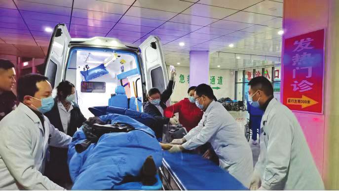 随州市中心医院启动应急预案,优化医疗资源,开通恶劣天气急诊患者就诊绿色通道。图为120救护车在风雪中抢运病人。