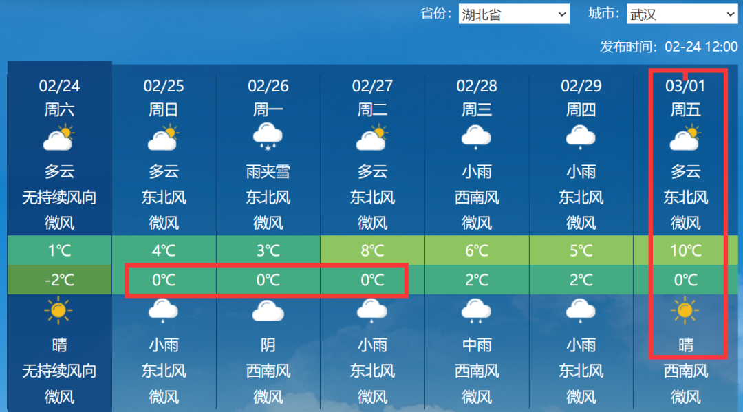 看来,这低温阴雨要活跃到2月的最后一天了!遥望一下,3月1日,武汉多云转晴天,0-10℃。
