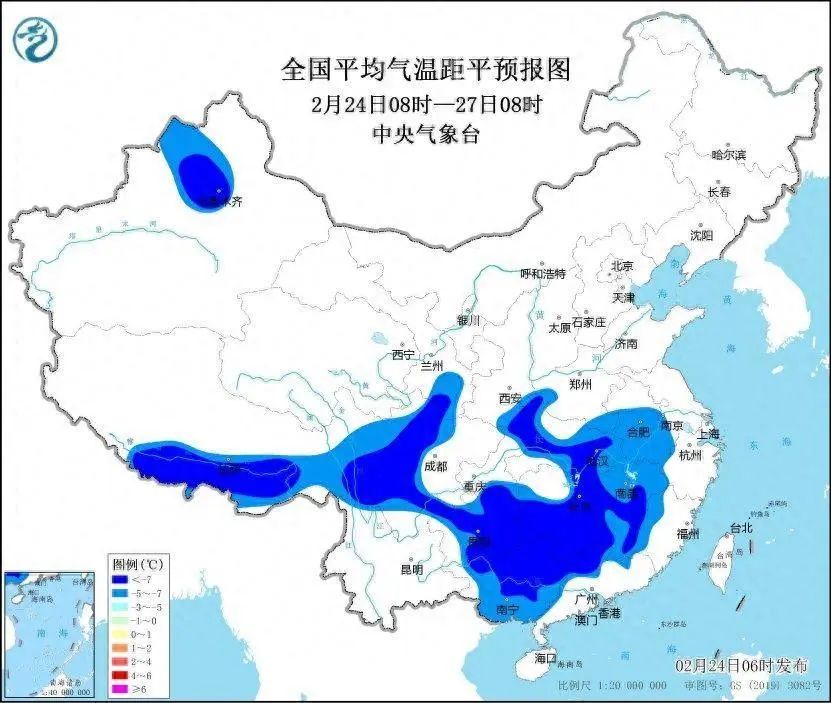 预计,2月24日08时至27日08时,江淮中西部、江汉大部、江南中部和西部、西南地区东部和北部、广西、广东北部以及陕西东南部、甘肃东南部、新疆沿天山地区、西藏南部等地的日平均气温较历史同期偏低5℃以上,其中,湖北中部和南部、湖南大部、江西中部、贵州大部、广西中北部、四川中西部、新疆沿天山地区等地的日平均气温较历史同期偏低7℃以上,最低气温0℃线将位于贵州西南部、广西北部、江西北部至江苏南部一带。