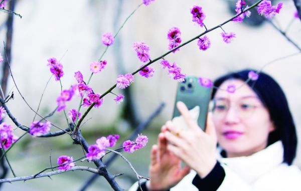 连日来,荆门龙泉公园内的梅花竞相盛开,吸引了众多市民前来赏梅拍照。(记者 郑波 摄)