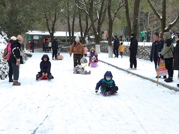近日连续降雪,牛头山森林公园银装素裹,呈现出别样的韵味与景致,有些地方还形成了雾凇景观。尽管公园禁止车辆进入,但仍挡不住市民赏雪、玩雪的热情。众多市民带着孩子在这里滑雪,还有人徒步锻炼身体,在雪中舞剑、打卡拍照,分外热闹。公园工作人员提醒,雪景虽美,但雪天路滑,游玩、拍雪景时要注意人身安全。图/记者 罗伟