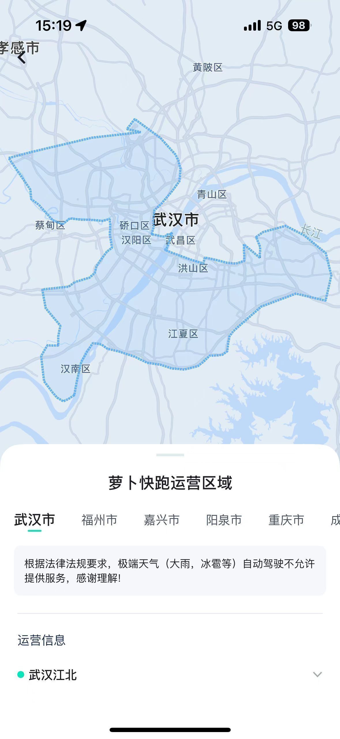 更新后的萝卜快跑在武汉服务区域。