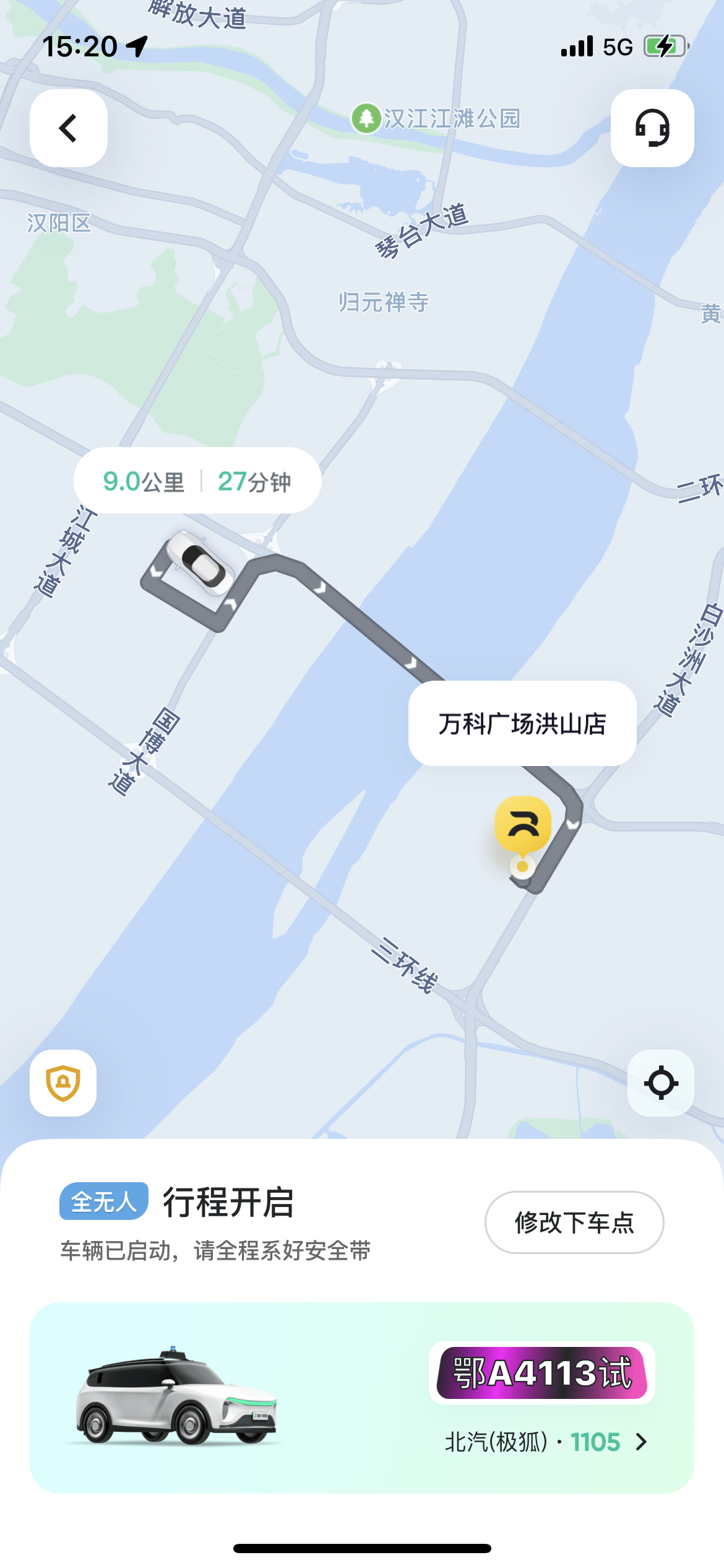 使用萝卜快跑可叫车从汉阳通过“杨泗港长江大桥”抵达武昌。
