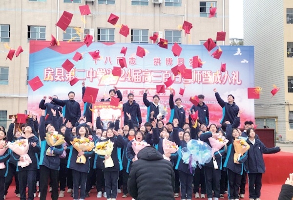2月28日,房县二中高三学子将“成人帽”高高抛起。图/通讯员钱丽
