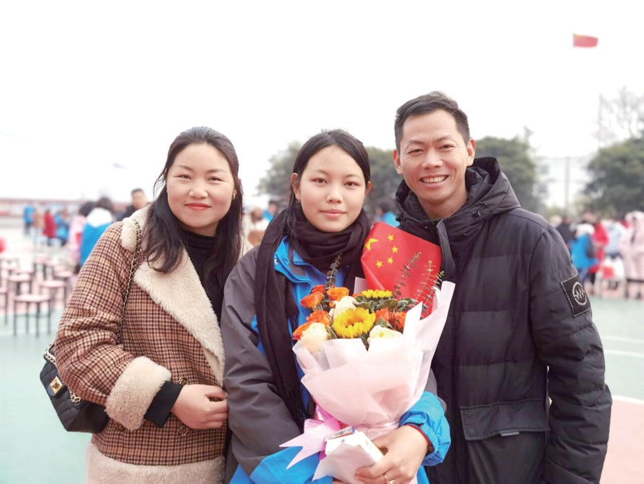 3月1日,丹江口二中高考誓师大会结束后,一名学生与家长合影。图/通讯员秦永刚