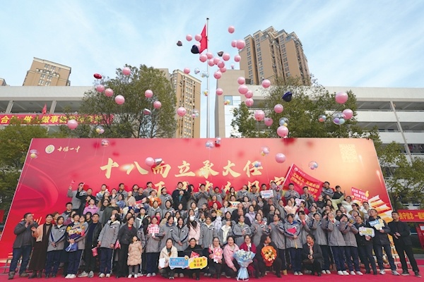 2月27日,市一中高三学子在百日誓师暨成人礼活动上放飞气球。图/记者王聪骢
