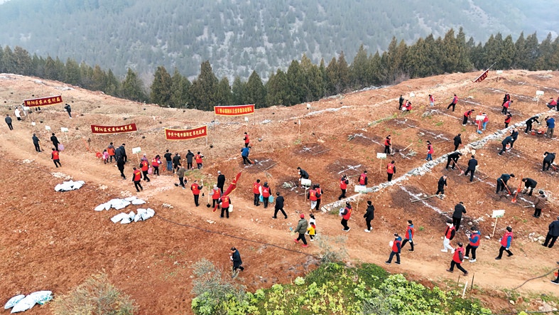 3月3日,郧阳区在杨溪铺镇大尖山开展“养青山、护水源、助振兴”植树活动,践行“两山”理念,推动完成汉江库区两岸种植油橄榄10万亩的目标,确保一库碧水永续北送。当日,200余名干部群众共种植油橄榄树近千棵。特约记者 李尚菲 摄