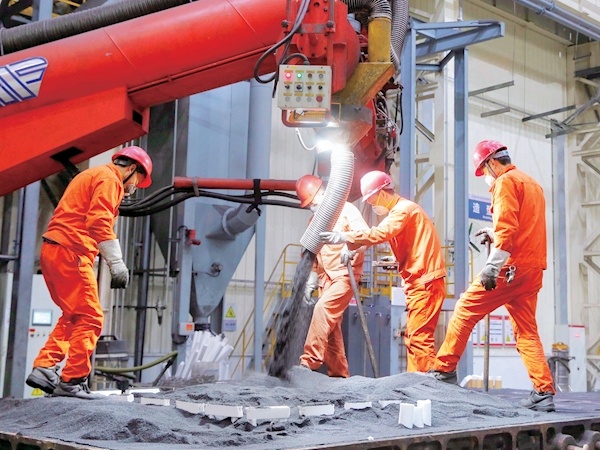 3月1日,在东风零部件集团通用铸锻分公司生产车间,工人正在操作机械设备进行填砂造型。开年以来,该公司保持满负荷生产,全力以赴赶订单。截至目前,已浇注铁水近3000吨。记者全正通讯员翁天华摄