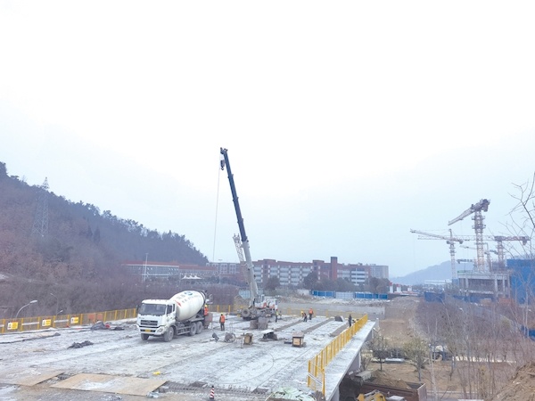 施工人员正加紧建设桥梁主体工程。