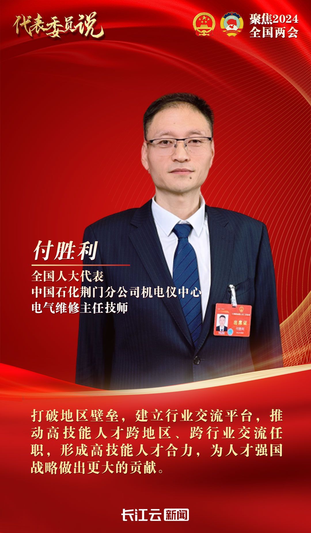 讲述人:全国人大代表 中国石化荆门分公司机电仪中心电气维修主任技师 付胜利